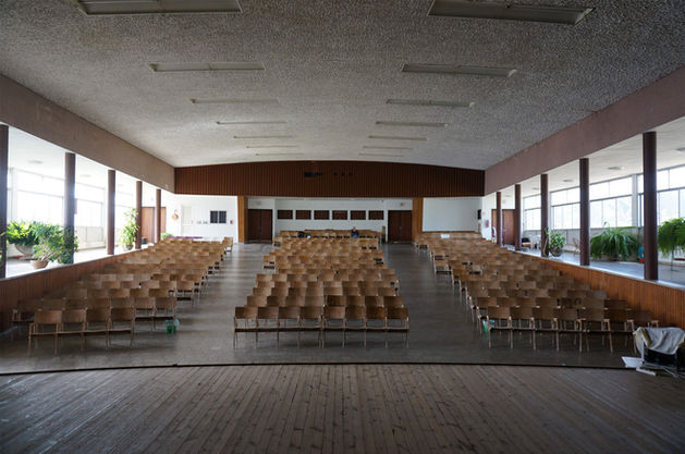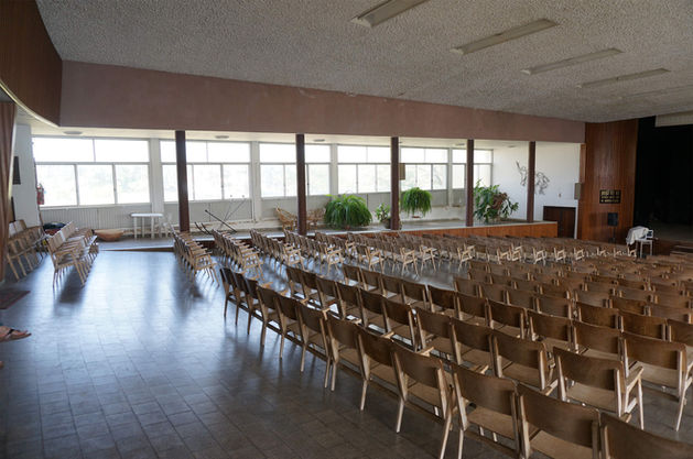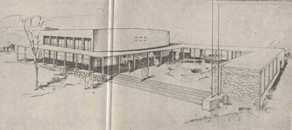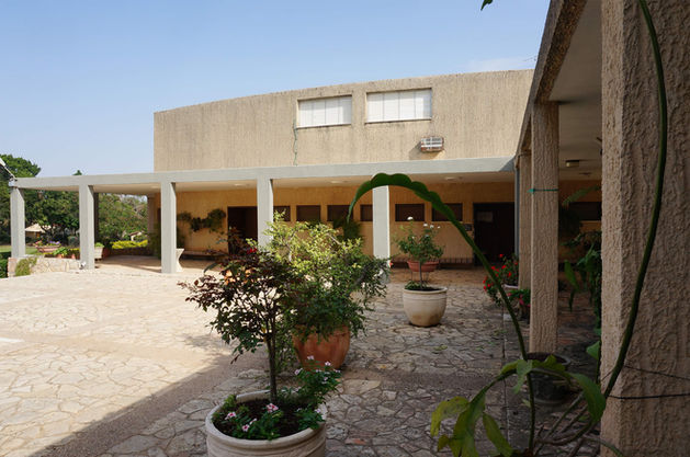 The Yad LaBanim house at the Ramat HaKovesh kibbutz was built between 1957-58. The structure is the memorial and cultural center of the kibbutz, then as well as now. It is used as the people’s house, with a large concert hall as well as memorial rooms. The house is located at the head of a green hill, with the view of the kibbutz on the one side and of the open fields on the other. The building has a wide staircase that leads to a large plaza framed by a colonnade of columns which connects the hall to the other spaces.