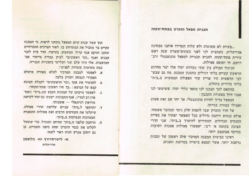 האדריכלים לייטרסדורף ובלזיצמן כתבו בספר "עלי עשור" לכבוד עשור לבית יד לבנים לפתח תקווה. 1963 | ארכיון עודד ירקוני